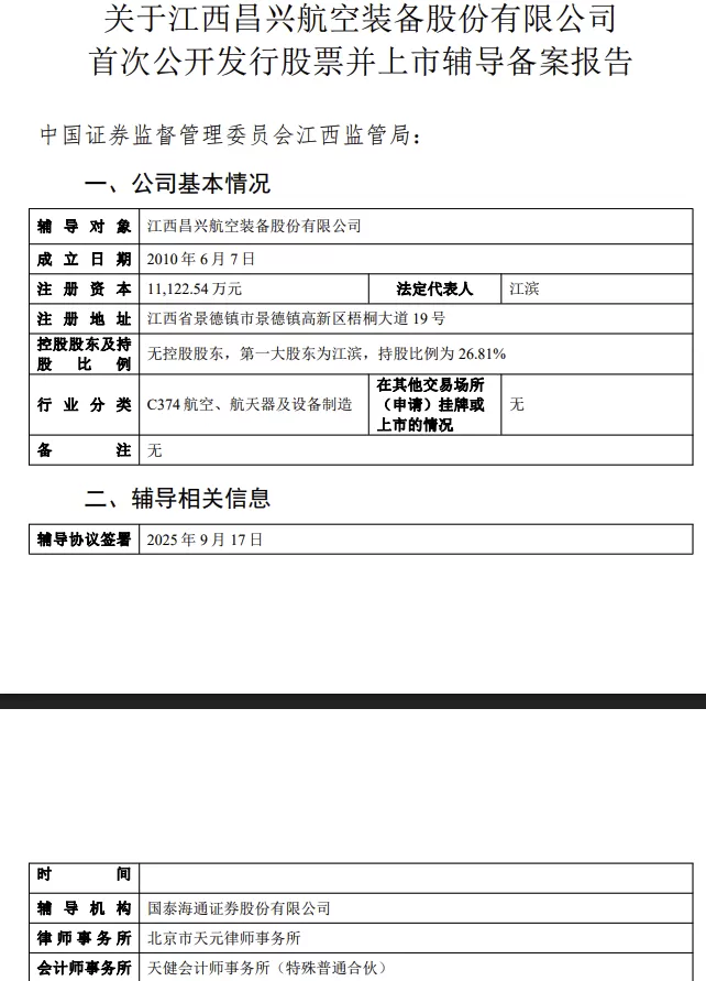 上海超群检测与江西昌兴航空启动上市辅导,中金和国泰海通担任辅导机构